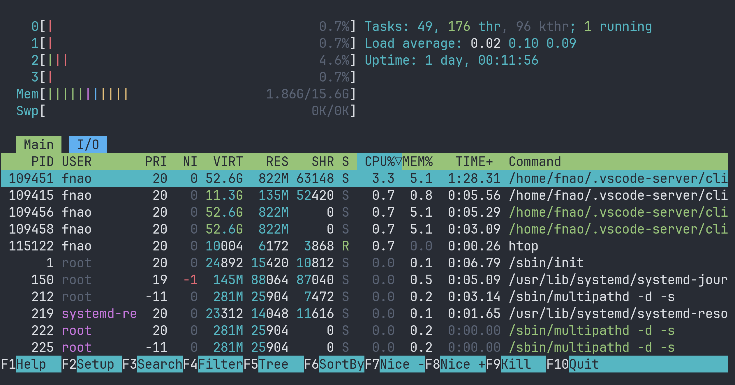 - See a real-time overview of system processes, CPU cores, memory, and swap usage.