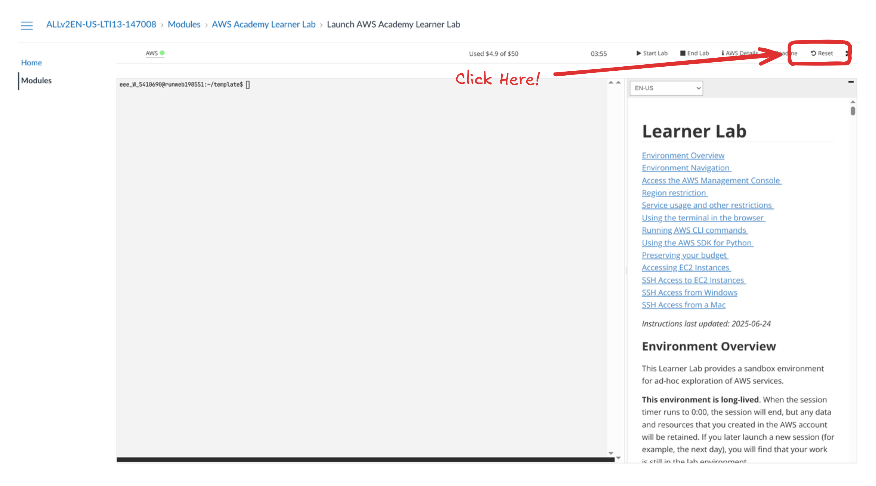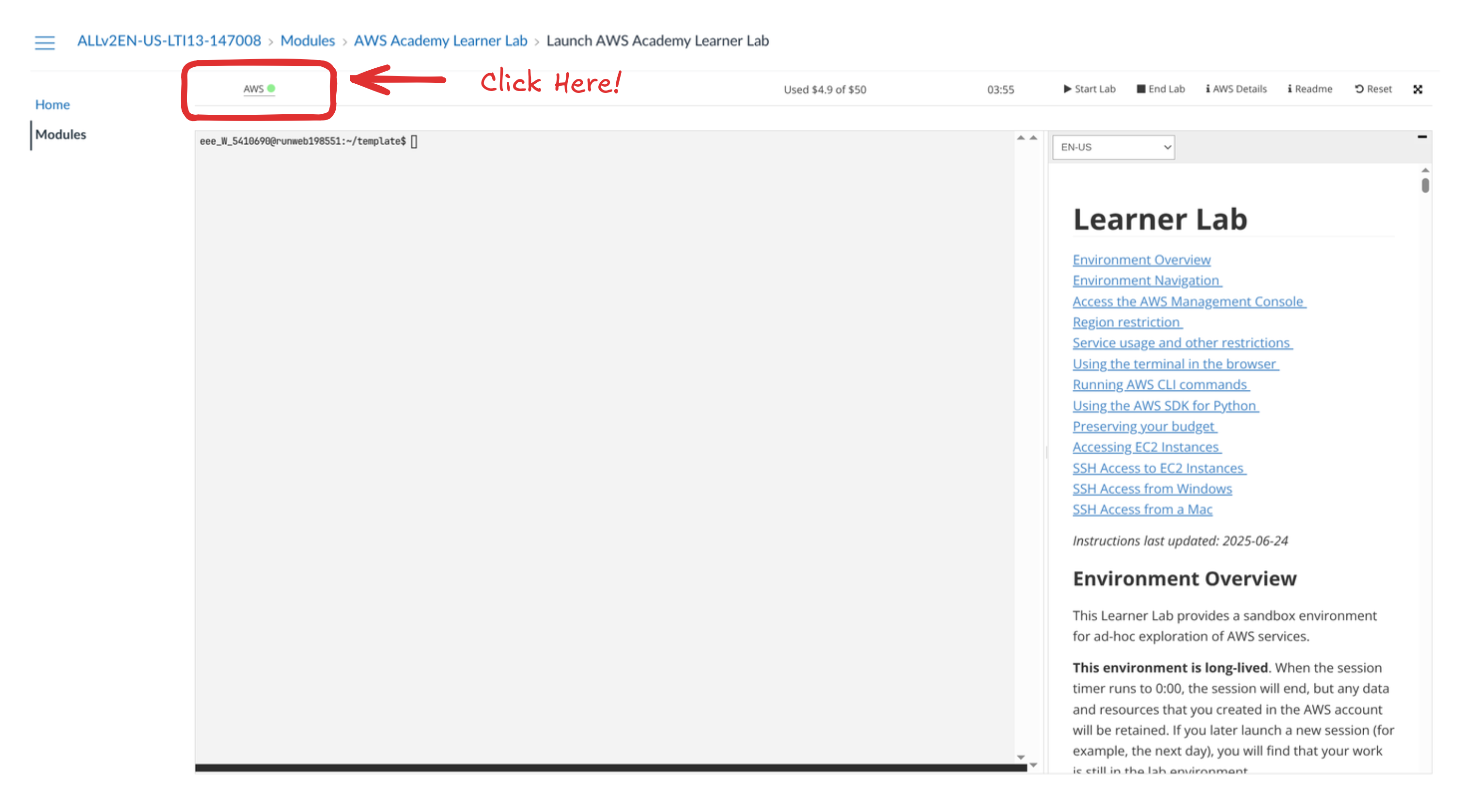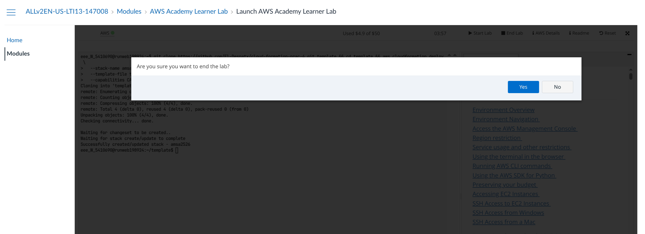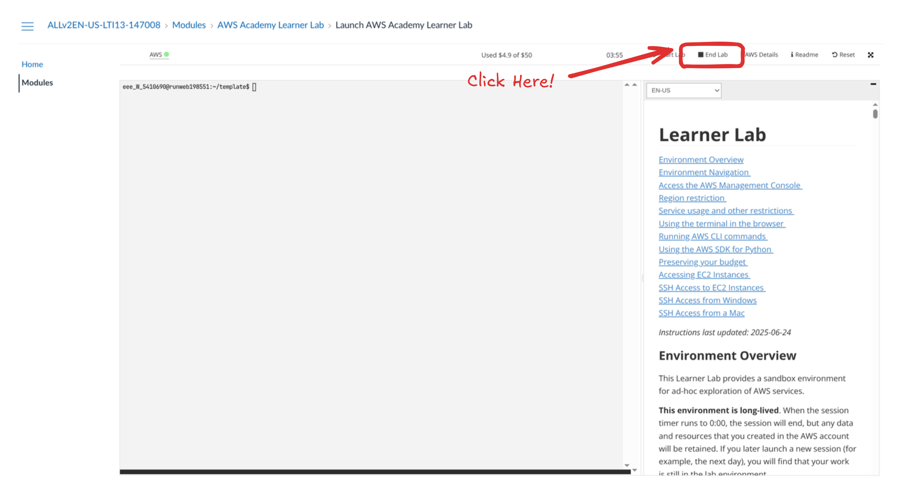 If you don’t end the lab, those resources may continue running and consume your limited AWS budget. While you can leave the lab without ending it, a misconfigured or resource-intensive service could use up your 50$ credit unexpectedly.