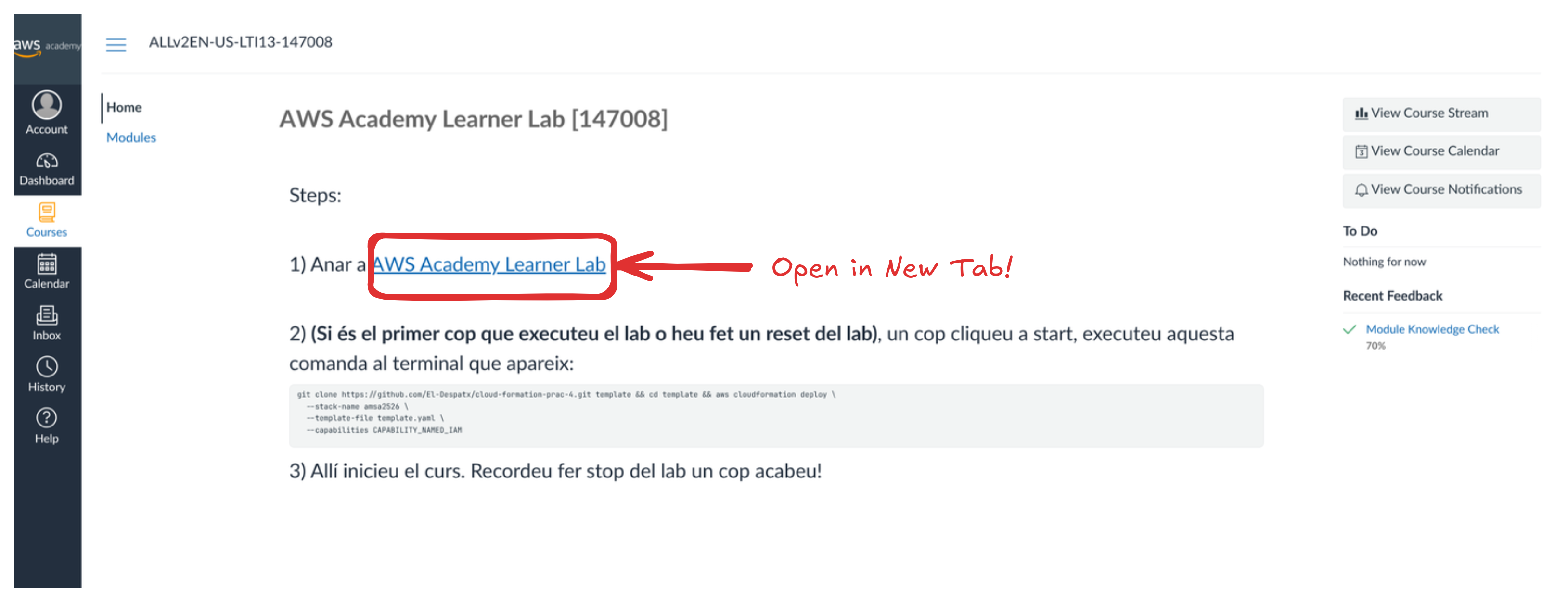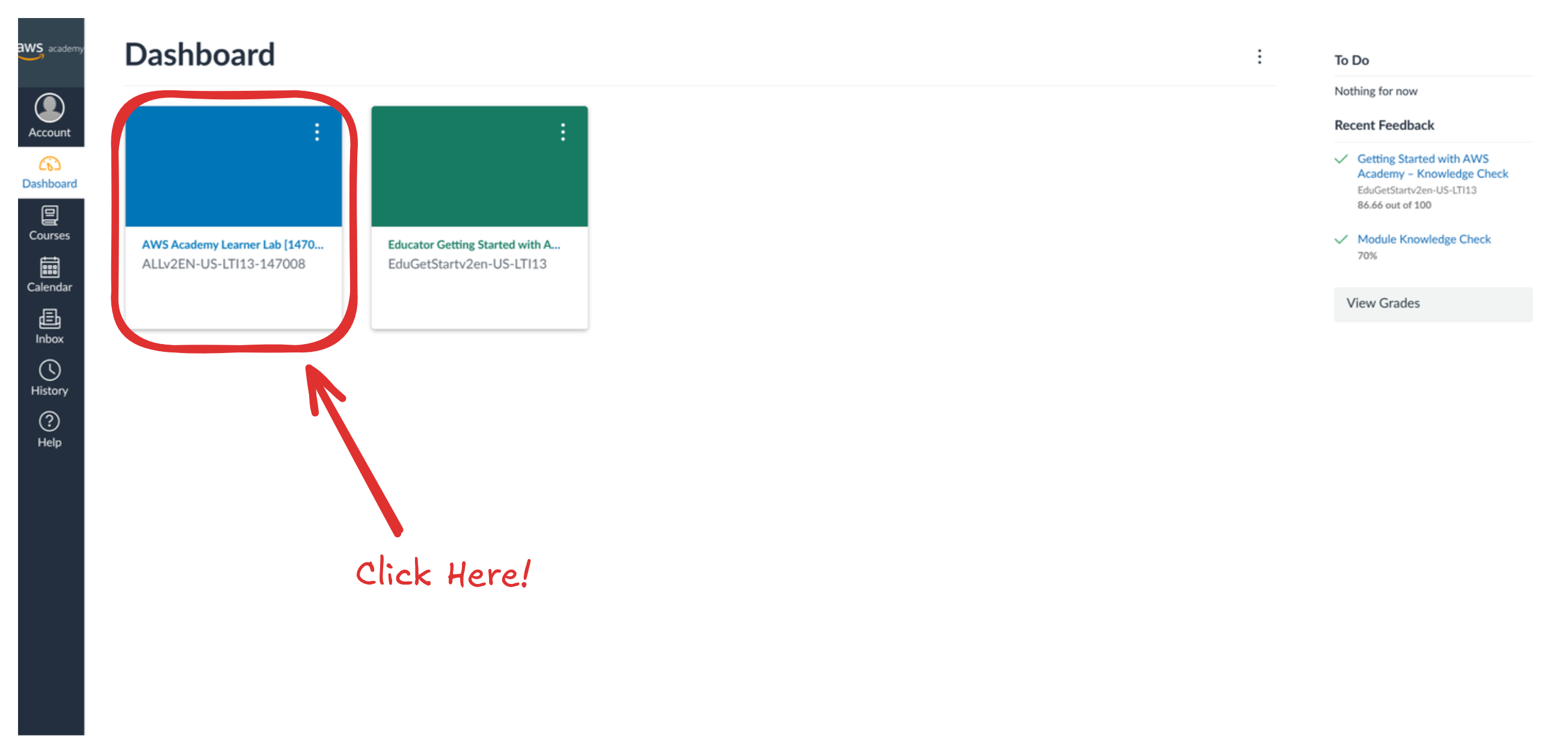 After that, it will show you the AWS-Academy Learning Management System page, you’ll se a dashboard with all your courses, click on the AWS Academy Learner Lab [147008] one!: