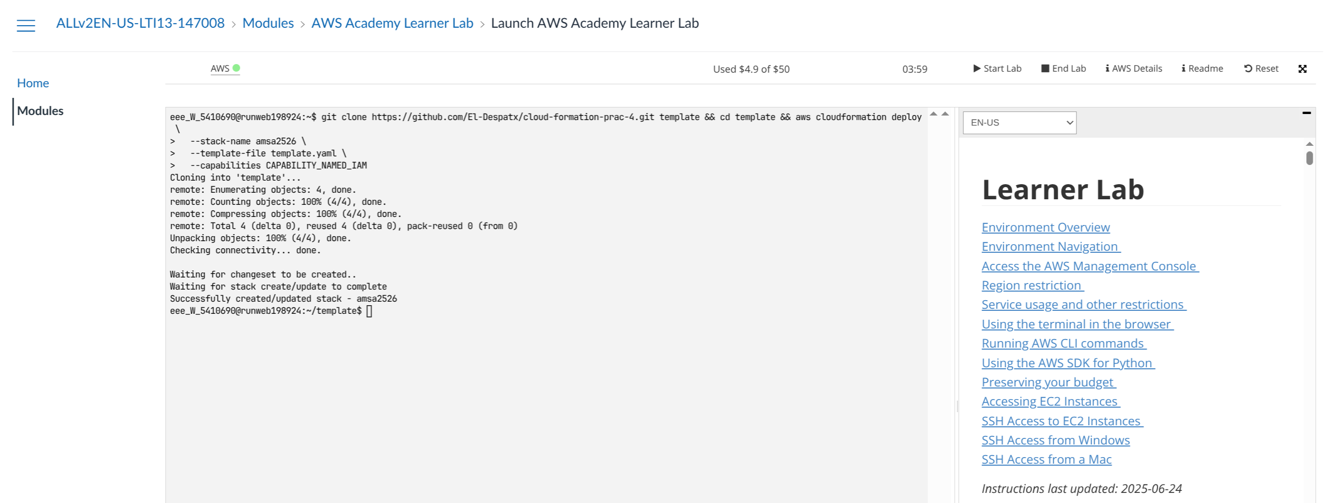--capabilities CAPABILITY_NAMED_IAMMake sure the lab is running (the indicator in the top-left corner should show AWS 🟢, not AWS 🔴):