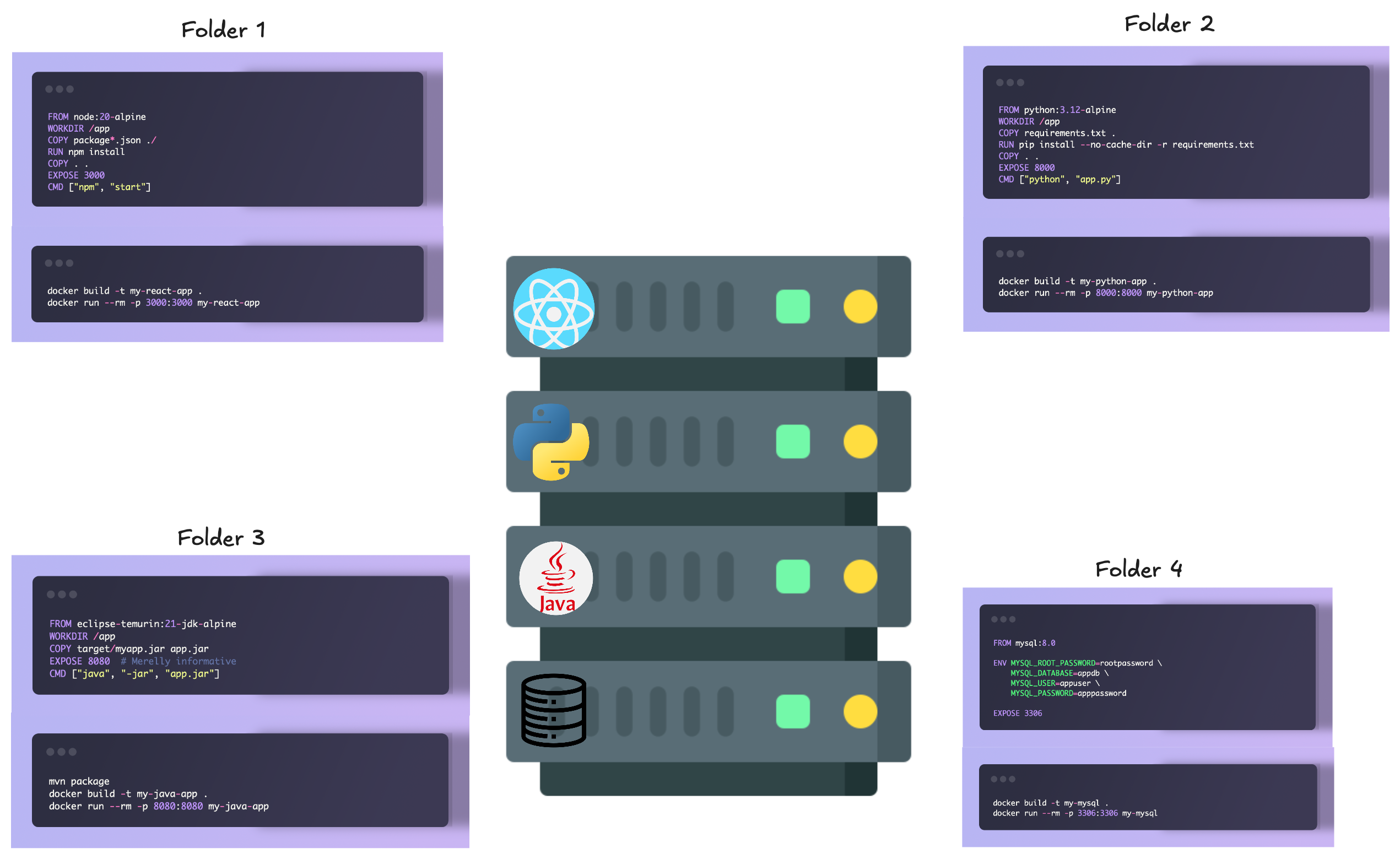 docker compose up -> Start all services (foreground)docker compose up -d -> Start all services (detached)docker compose down -> Stop all servicesdocker compose ps -> List all running servicesdocker compose logs -> View logs from all servicesdocker compose exec api bash -> Open a bash terminal in the api serviceDocker allows us to scale services easily: